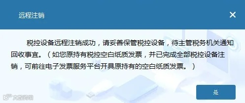 如具备资格则自动进行税控设备远程注销,远程注销成功后,剩余税控空白纸质发票将会自动切换至电票平台开具,剩余税控空白电子发票将会自动退回税务局端,无需进行操作。