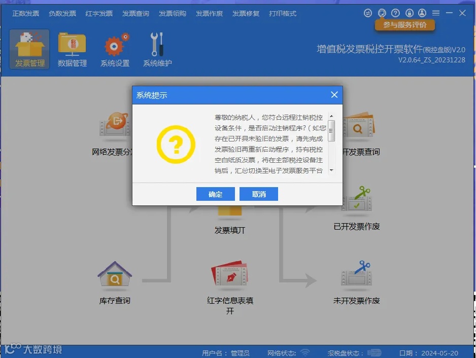 5、打开增值税发票开票软件提示具备远程注销税控设备资格后,是否需要立即执行注销操作?