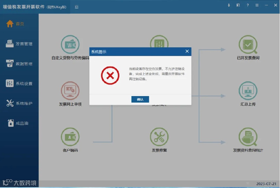 (2)如校验不通过,则自动弹出相应提示,纳税人按提示完成对应业务后,重启开票软件即可再次进行远程注销税控设备操作。