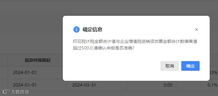 “印花税计税金额合计值与企业增值税进销项发票金额合计数偏离值超过500,请确认申报是否准确?”
