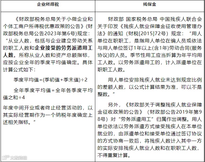 (1)企业所得税的从业人数包括企业接受的劳务派遣用工人数,而残保金的人数中,首先,劳务派遣人员是属于派出方的,其次,以派遣方式接受残疾人在本单位就业的,人员归属由派遣单位和接受单位通过签订协议的方式协商确定归属,这也可能存在口径差异。所以在人数统计方面,企业所得税口径的人数和残保金的职工人数就存在差异。