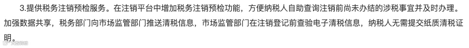 在注销平台中增加税务注销预检功能,方便纳税人自助查询注销前尚未办结的涉税事宜并及时办理。加强数据共享,税务部门向市场监管部门推送清税信息,市场监管部门在注销登记前查验电子清税信息,纳税人无需提交纸质清税证明。