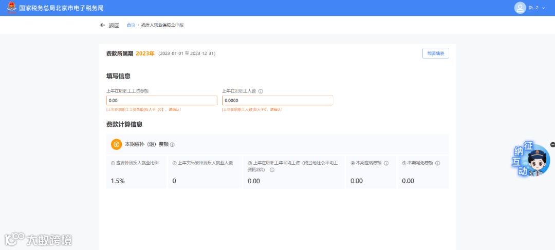 2.确认预填的上年实际安排残疾人就业人数数据是否正确,并补充上年在职职工工资总额、上年在职职工人数。