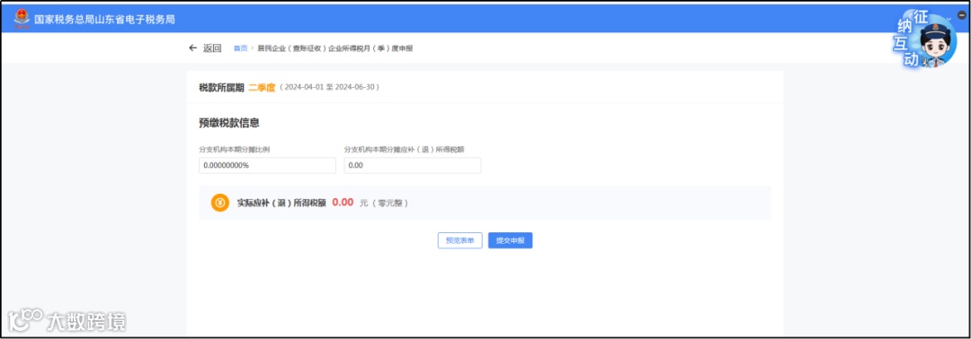 新电子税务局场景化办税对“业务简单”标签的纳税人设置为“确认式申报”方式,您单位为分支机构类型,“分支机构分摊比例和分支机构本期分摊应补(退)所得税额”两项内容可通过总机构申报信息获取(未获取到的可再自主填写),因此只需确认带出数据,确认无误提交申报即可。如需查看申报表,可点击“预览报表”查看,如下图所示: