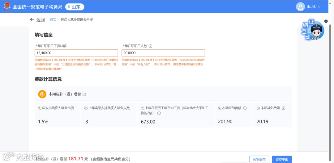 2.纳税人可对上年在职职工工资总额、上年在职职工人数等数据进行依次填写和修改,确认无误后点击“提交申报”,进入申报提交页面,申报成功后跳转申报结果反馈页面。