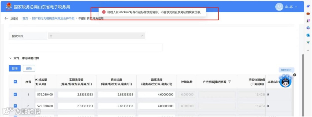 2、我单位在新电子税务局申报环境保护税计算减免税款时,系统提示纳税人在2024年5月存在超标排放的情形,不能享受减征及免征的税收优惠,怎么办?