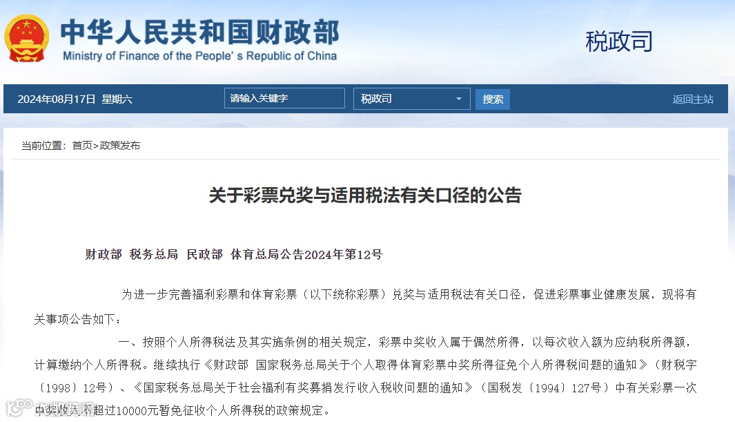 一、按照个人所得税法及其实施条例的相关规定,彩票中奖收入属于偶然所得,以每次收入额为应纳税所得额,计算缴纳个人所得税。继续执行《财政部 国家税务总局关于个人取得体育彩票中奖所得征免个人所得税问题的通知》(财税字〔1998〕12号)、《国家税务总局关于社会福利有奖募捐发行收入税收问题的通知》(国税发〔1994〕127号)中有关彩票一次中奖收入不超过10000元暂免征收个人所得税的政策规定。