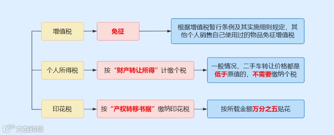 个人将自己使用过的物品对外出售,不需要缴纳增值税,由于二手物品的价格通常低于原值,也无需缴纳个人所得税,仅需要按0.5‰缴纳印花税即可。