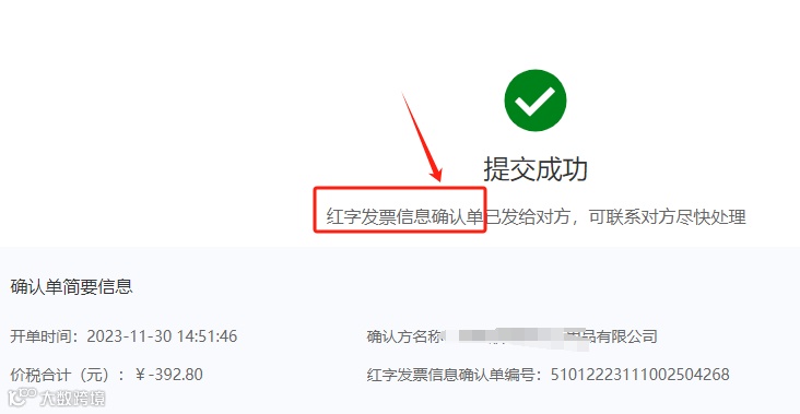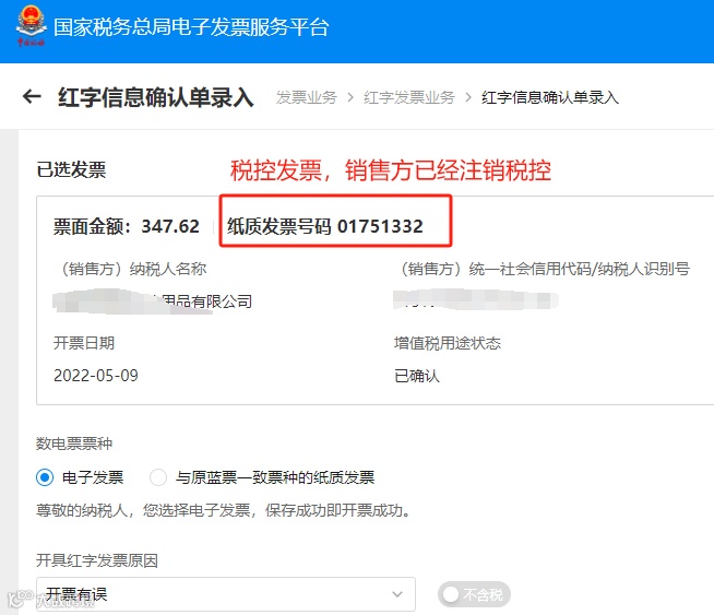 确认单传递到购买方,购买方登录平台确认后,销售方就可以用数电发票红冲这张税控发票了。