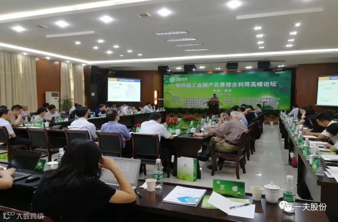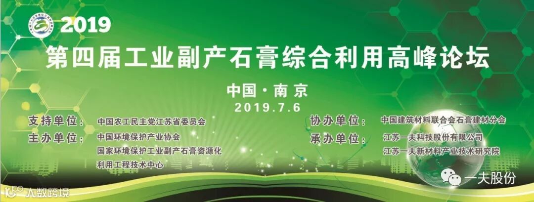 7月6日, 2019第四届工业副产石膏综合利用高峰论坛在南京举行,本次论坛由中国农工民主党江苏省委员会作为支持单位,由中国环境保护产业协会、江苏一夫科技股份有限公司(国家环境保护工业副产石膏资源化利用工程技术中心)主办,江苏一夫新材料产业技术研究院承办,中国建筑材料联合会石膏建材分会协办。工业副产石膏相关产业政府主管部门代表、知名专家学者,行业协会、企业、科研院所和高校代表60余人出席论坛。