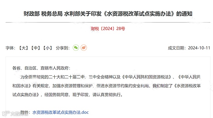 10月15日,财政部 税务总局等三部门发布了关于《水资源改革试点实施办法》的通知,宣布开始征收水资源税。