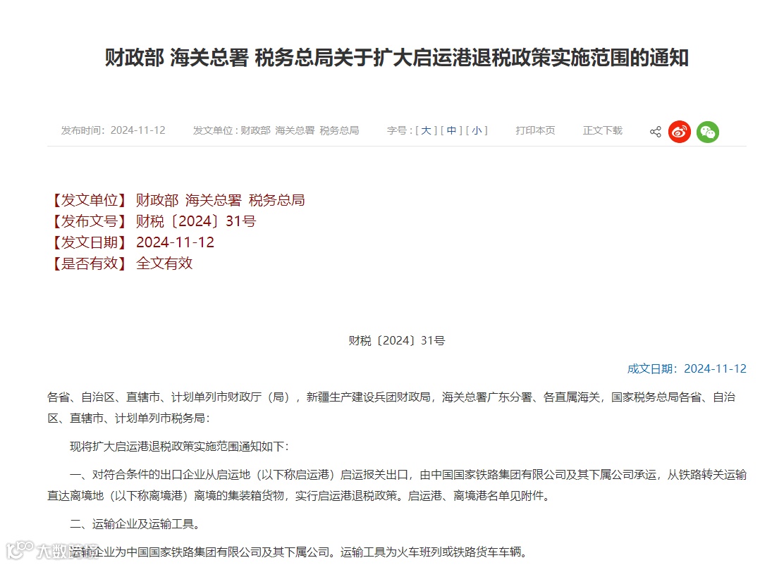 一、对符合条件的出口企业从启运地(以下称启运港)启运报关出口,由中国国家铁路集团有限公司及其下属公司承运,从铁路转关运输直达离境地(以下称离境港)离境的集装箱货物,实行启运港退税政策。