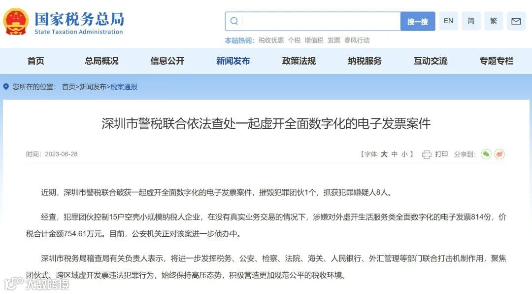 经查,犯罪团伙控制15户空壳小规模纳税人企业,在没有真实业务交易的情况下,涉嫌对外虚开生活服务类全面数字化的电子发票814份,价税合计金额754.61万元。目前,公安机关正对该案进一步侦办中。