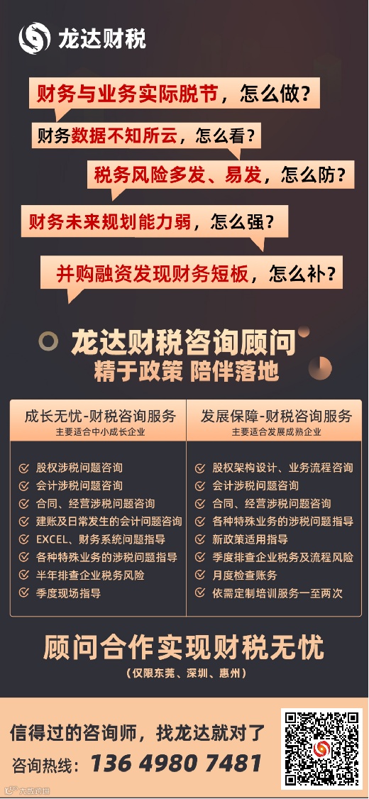 以上就是政策解读了,还有老板不清楚的马上咨询龙达财税顾问,精于政策陪伴落地,直接点击下方图片立即咨询