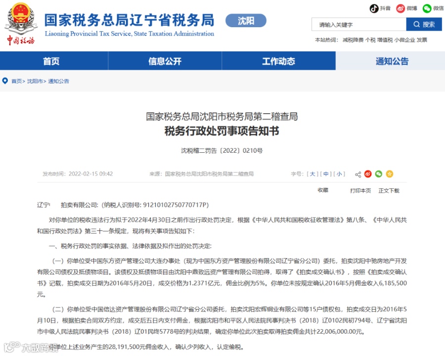 2022年2月,辽宁某拍卖有限公司便是在注销后仍然被查,补税罚款合计3000多万元。