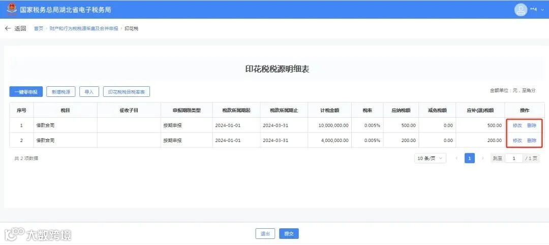⑦印花税税源采集成功后可在印花税税源明细表-税源信息处查看,点击【修改】可以打开印花税税源明细界面进行修改,点击【删除】按钮可以进行删除。