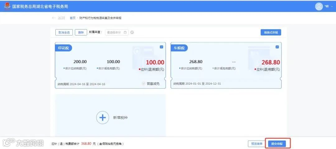 ①自动带出本期应申报的所有税种卡片,纳税人可以自行勾选单个或多个税种进行申报。