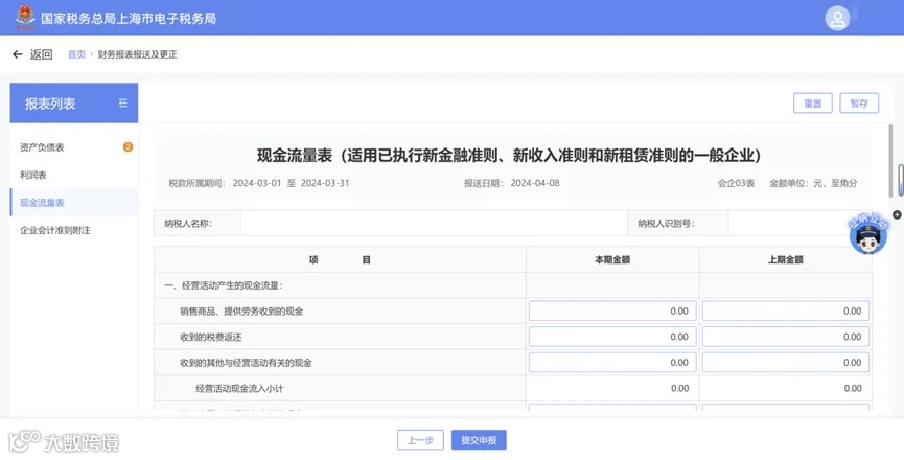 完成备案信息修改后,依次点击【我要办税】-【税费申报及缴纳】-【财务报表报送】-【财务报表报送及更正】进入,系统将自动带出现金流量表,就可以开始填报啦!