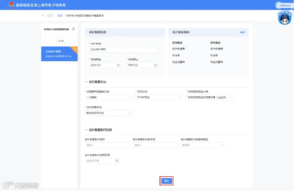 点击进入“财务会计制度及核算软件备案报告”模块后,系统将自动带出您当前正在使用的备案信息。