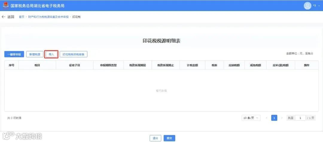 ⑥印花税税源明细采集支持导入功能,点击【导入】弹出导入报表信息功能窗口,点击【下载模板】可以下载印花税税源明细表模板,填写模板表格后点击【确定】将报表中数据导入功能界面明细表中。