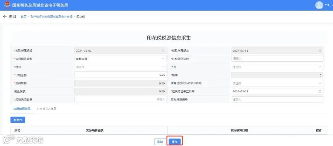 ⑤采集印花税源明细时,点击【新增税源】,录入税源信息,在新增税源模块录入税源信息,填写完毕后点击【保存】。