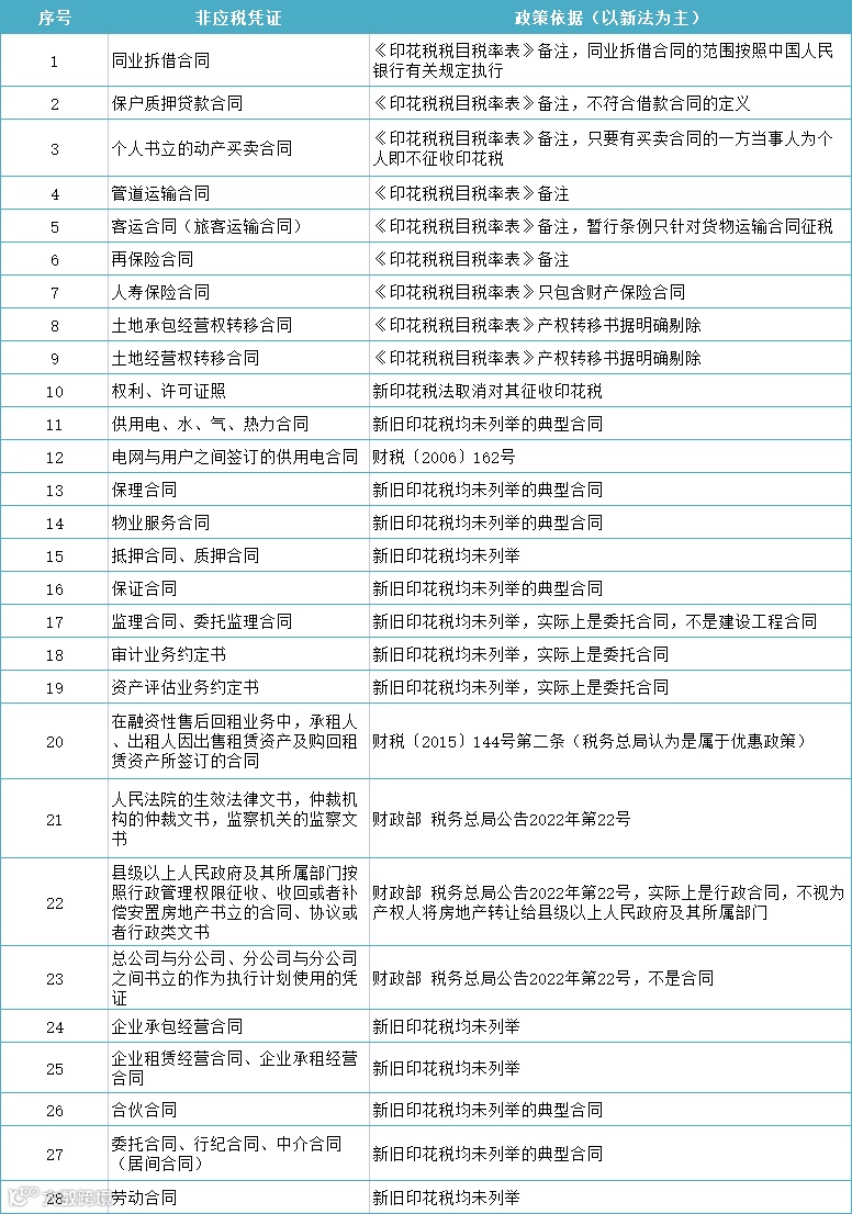 在《印花税法》自2022年7月1日施行后,无需缴纳印花税的非应税凭证列表(提示:本表未列举免税的应税凭证。不属于征税范围与免税是有本质区别的):