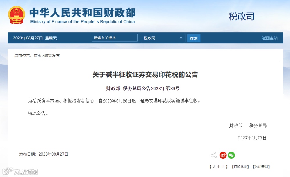 8月27日,财政部网站发布《关于减半征收证券交易印花税的公告》,公告全文如下: