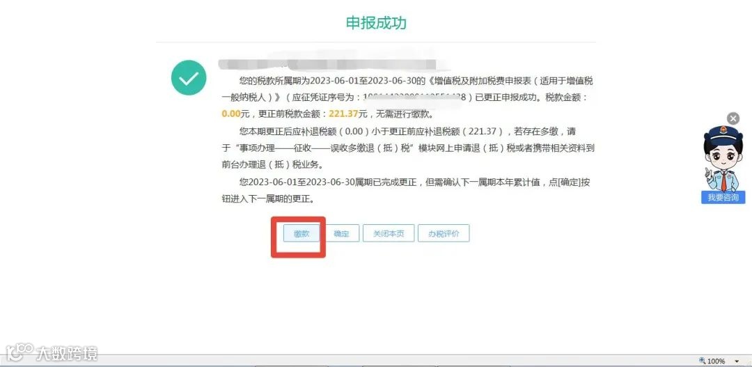 如果更正后产生需要补缴税款的,点击“缴款”,可以进行更正后应缴税款进行补交。