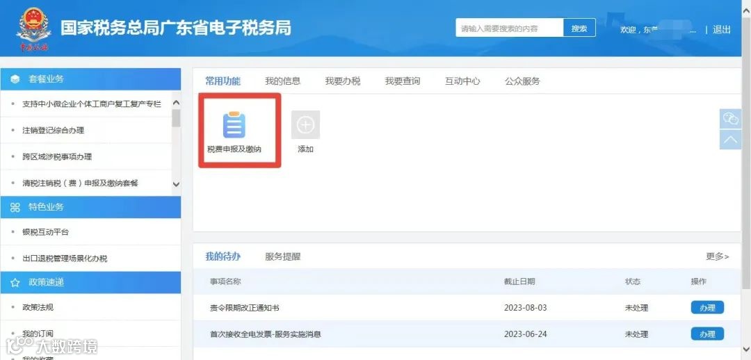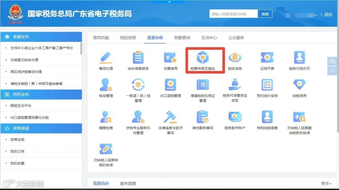 纳税人可登录电子税务局,点击首页左边“常用功能—税费申报及缴纳”模块,或点击“我要办税—税费申报及缴纳”。