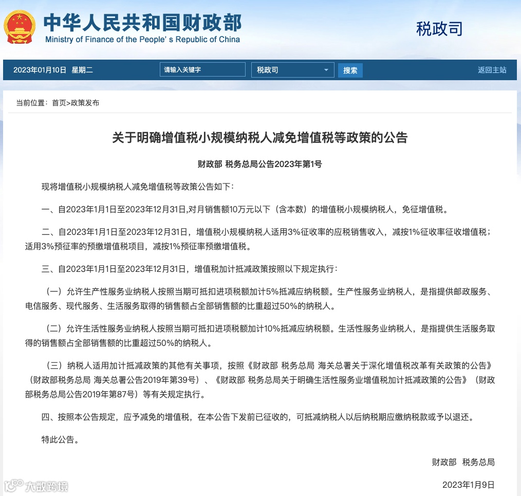 2023年1月9日,国家税务总局财政部正式发布了《关于明确增值税小规模纳税人减免增值税等政策的公告》(财政部 税务总局公告2023年第1号),明确了2023年小规模纳税人减免增值税等政策!