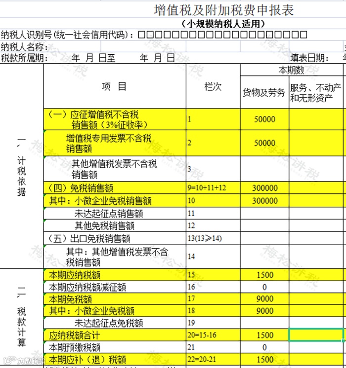 例:A公司为按季申报的小规模纳税人,2022年10月-12月销售货物情况如下:开具免税普票销售额:300000元,开具3%专用发票销售额(不含税):50000元。