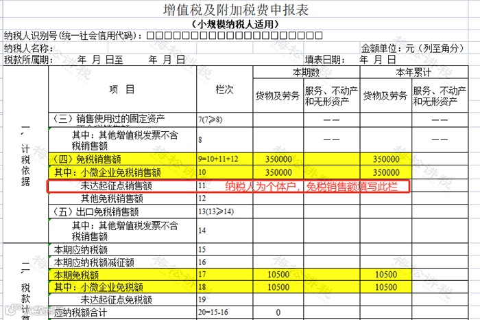 分析:免税销售额=350000元;免税额=350000×3%=10500元