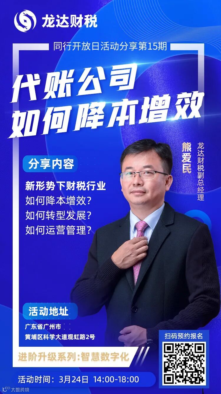 我们到底该怎么办?为了解决大家遇到的难题,我们特地请来了深耕财税行业20多年的龙达财税副总经理「熊爱民」为我们讲解如何在竞争激烈的代账行业中实现降本增效!