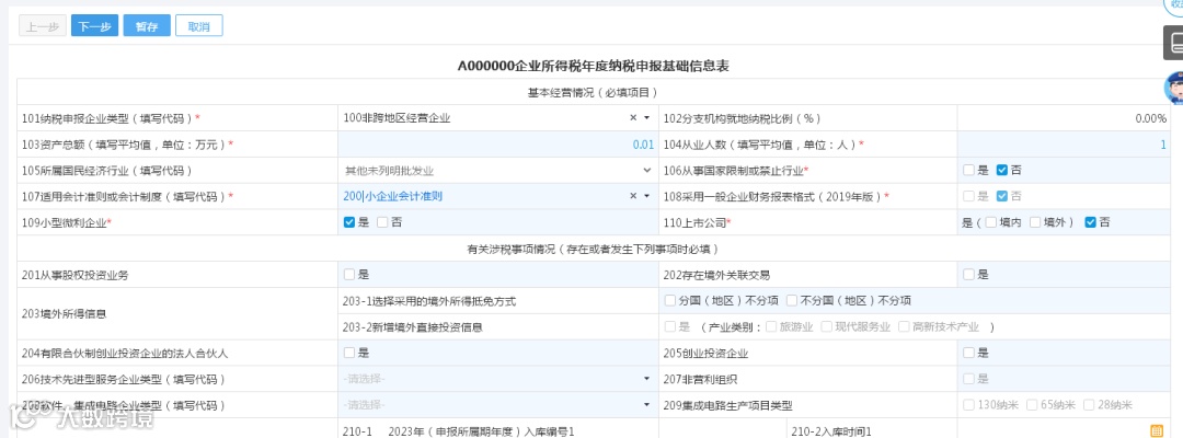 最后小龙提示: 小型微利企业可免于填报《企业所得税年度纳税申报基础信息表》(A000000)中的 “主要股东及分红情况”、《一般企业收入明细表》(A101010)、《金融企业收入明细表》(A101020)、《一般企业成本支出明细表》(A102010)、《金融企业支出明细表》(A102020)、《事业单位、民间非营利组织收入、支出明细表》(A103000)、《期间费用明细表》(A104000)。