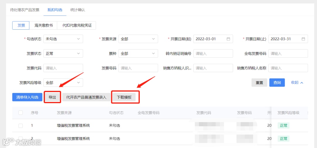 勾选发票数量较多时,可全量导出未勾选发票并【下载模板】,将导出发票的数据根据模板填写要求填入Excel表后,选择【清单导入勾选】。