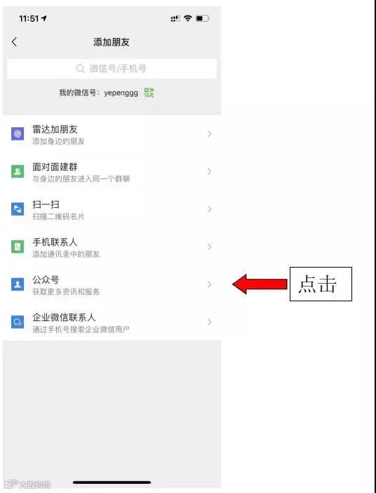 1.微信点击通讯录,添加公众号 ;