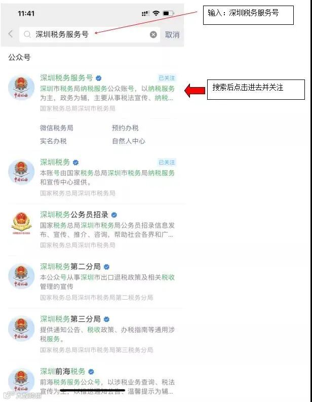 2.点击公众号,搜索深圳税务服务号;