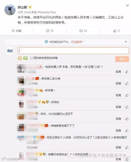 亿邦动力网了解到,今年8月21日,腾讯微信安全风控中心高级总监郑立鹏曾发布微博称“关于传销,微信平台只允许两级(包括发展人员本身)分销模式,三级以上分销,会停微信支付功能和封停帐
