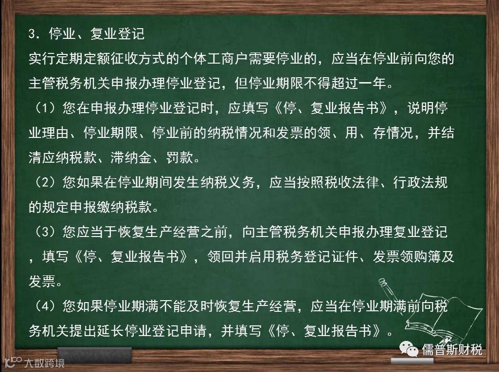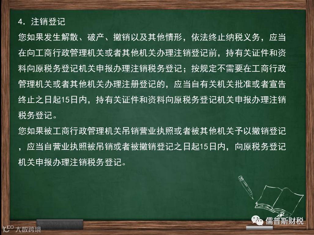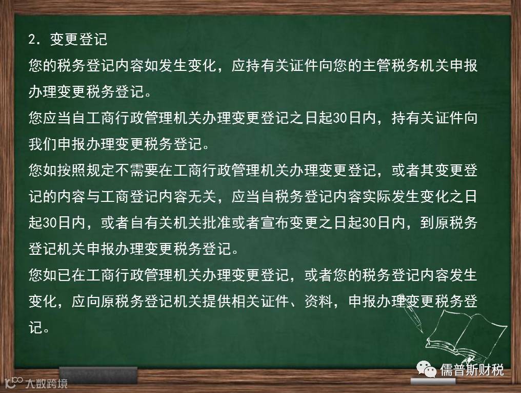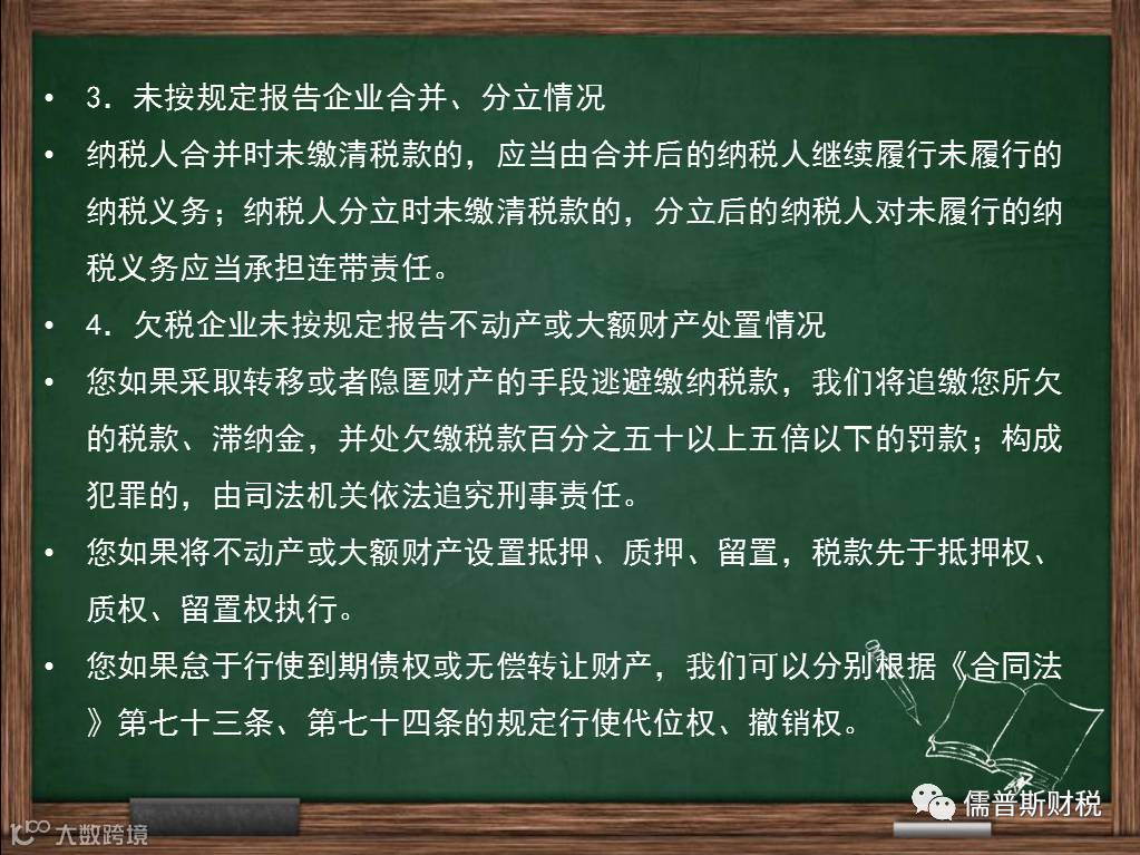 2.企业合并、分立的报告义务。您有合并、分立情形的,应当向我们报告,并依法缴清税款。合并时未缴清税款的,应当由合并后的纳税人继续履行未履行的纳税义务;分立时未缴清税款的,分立后的纳税人对未履行的纳税义务应当承担连带责任。