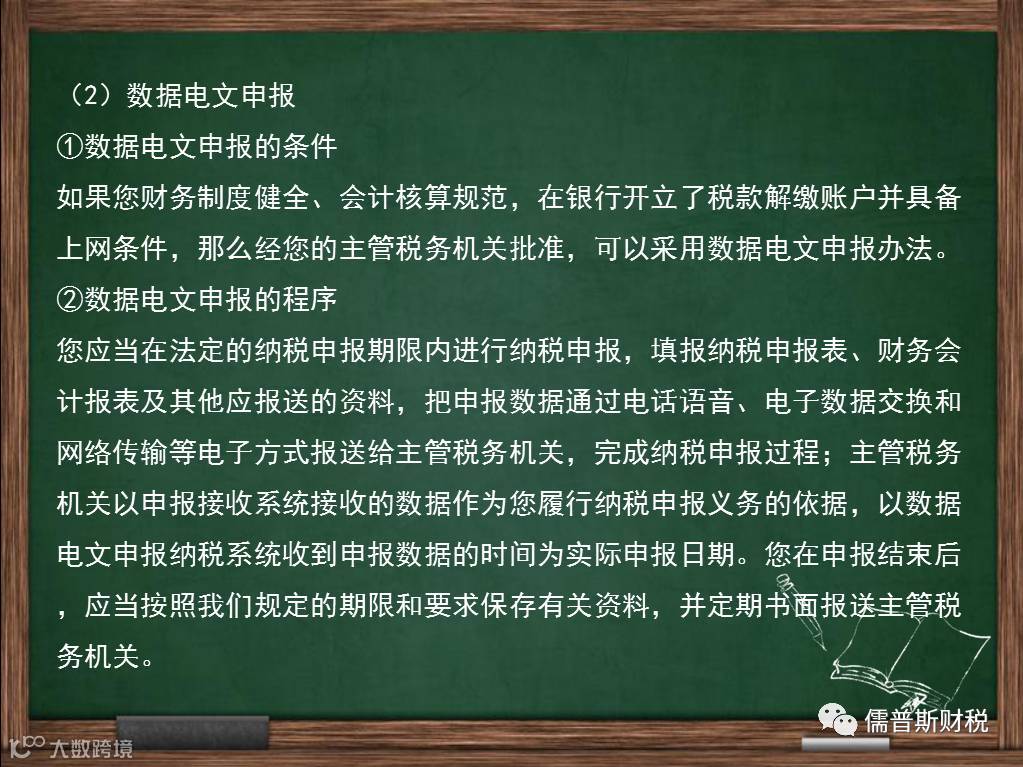 3.数据电文申报,是指您通过税务机关确定的电话语音、电子数据交换和网络传输等电子方式进行纳税申报。数据电文申报以税务机关收到申报数据的时间为实际申报日期。