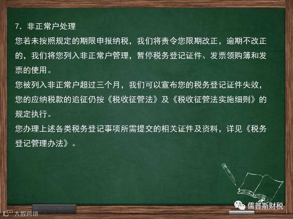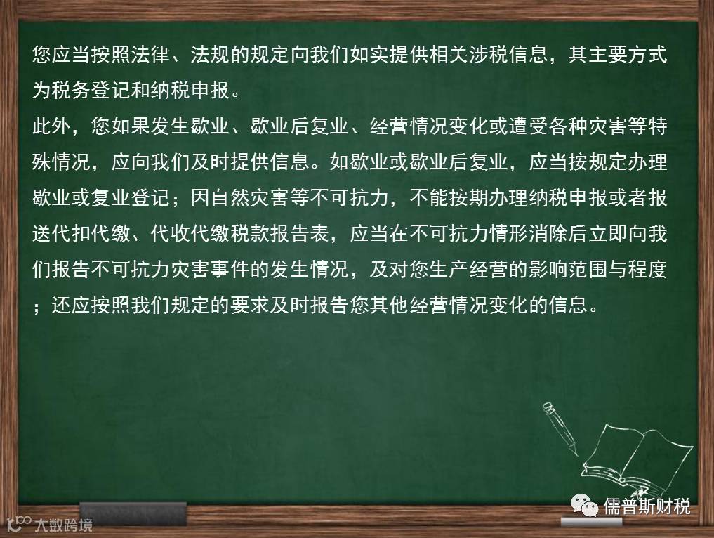 您除通过税务登记和纳税申报向我们提供与纳税有关的信息外,还应及时提供其他信息。如您有歇业、经营情况变化、遭受各种灾害等特殊情况的,应及时向我们说明,以便我们依法妥善处理。