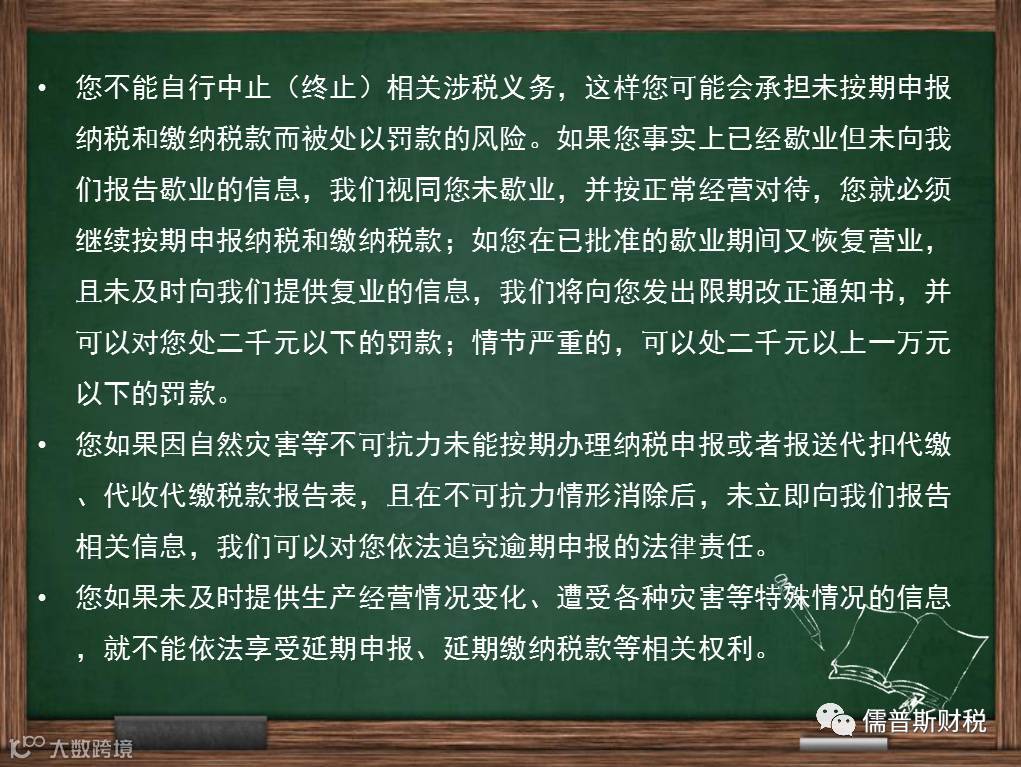 您应当按照法律、法规的规定,通过税务登记和纳税申报等方式向我们如实提供相关涉税信息。如果您在生产、经营过程中,出现某些特殊情况,如发生歇业、歇业后复业、经营情况变化、遭受各种灾害等,也应及时向我们报告和说明,以便我们依法根据您的情况中止(终止)您的纳税申报义务,或准许您延期纳税申报或延期缴纳税款,或免除您因不可抗力等因素逾期纳税申报或逾期缴纳税款的法律责任。