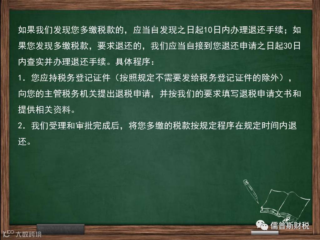 对您超过应纳税额缴纳的税款,我们发现后,将自发现之日起10日内办理退还手续;如您自结算缴纳税款之日起三年内发现的,可以向我们要求退还多缴的税款并加算银行同期存款利息。我们将自接到您退还申请之日起30日内查实并办理退还手续,涉及从国库中退库的,依照法律、行政法规有关国库管理的规定退还。