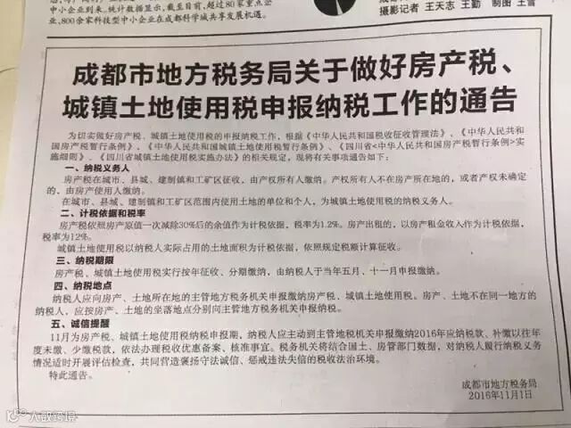而就在11月1日,成都地税部门发出的一张《房产税申报纳税工作的通告》吓得有房产的成都市民赶紧默默算账:怎么突然就要征税了呢?全国广大的买得起房买不起房的吃瓜群众也坐不住了,纷纷表示是不是房地产税真要来了?