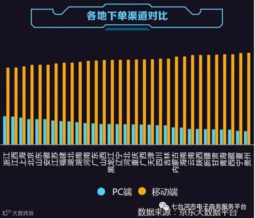 并且随着智能手机等移动端设备普及,让中西部地区更多的消费者可以触网购物。据告显示,贵州的移动端消费占比接近九成,领跑全国。前七名贵州、宁夏、青海、西藏、甘肃、新疆、陕西均为西部城市,移动端占比均在85%以上。