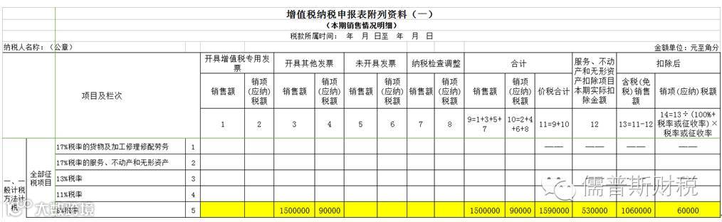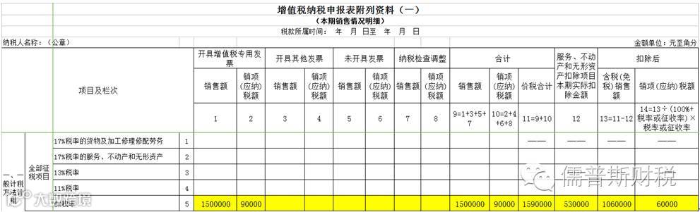 2.通过本月合计销售额还原计算得出的专用发票销售额150万与税额9万分别填入《增值税纳税申报表(一般纳税人适用)》附列资料(一)第5栏第1、2列。