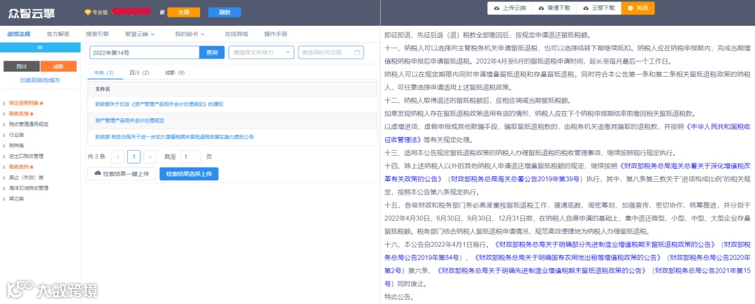 手机端:关注公众号【众智云擎税法检索】,点击公众号的菜单栏—移动云擎即可查询。