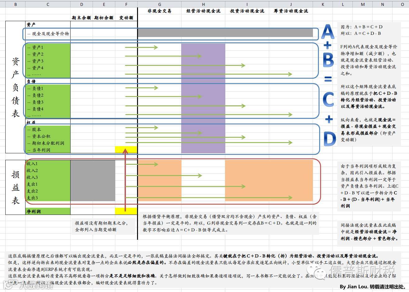 先说一下在审计师中广为流传的编制现金流量表的方法。这里只讲原理,不讲具体科目。看完原理,我相信稍加练习每个有会计基础的审计工作人员和财务人员都能编出一张平的现金流量表来。但是,要编好一张现金流量表,让他更准确的体现企业的现金流情况,那可能就需要一点功力了。
