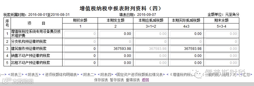 解决方案:这户纳税人之所以出现这样的提示,是因为该纳税人预缴的数据367593.98是大于本期申报的应纳税额360640.42,所以导致系统报错。只要纳税人把附表四的本期实际抵减税额改成与本期应纳税额合计栏一样的数字即可解决。剩下没有抵的预缴税额下期会滚到附表四的期初余额,下次再抵。