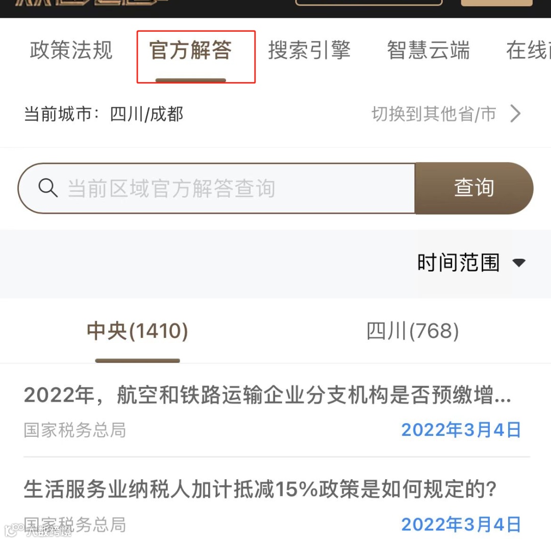 在搜索引擎的查询框内输入关键词检索税法政策,点击【官方解答】即可一览全国范围内相关政策问答